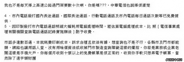 市話多達數百通,本就耗費印刷成本,訴求合理且依法有據,想查詢也不是不行,各縣市及門市都能辦,網路也讓用話人查,沒有用啥個資法或收掉門市製造查詢障礙這樣的爛招,你若是業務或企業老闆這樣是手機大戶,你每個月收到十張以上的免費帳單是很正常的,收到你手軟只想弄電子帳單,當然除了遠字頭財團