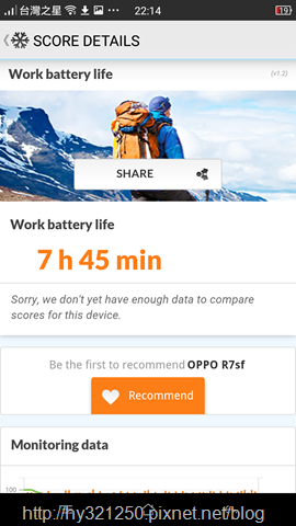 OPPO R7s使用3070mAh鋰電池,以去陽明山追雪小旅行來說,上下山搭車過程看影片,追雪過程大量拍照與天氣較冷狀況下,感覺R7s電力還蠻持久的。而以量化的PCMark電池效能的測試測試結果,電池可撐7小時45分鐘。