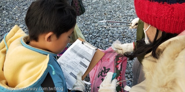 我淨灘撿拾到非自然物品中,真的以瓶蓋最多,那就表示不少遊客到這裡會亂丟瓶蓋,其實蠻讓人難過的。因為,跟我們同組淨灘的荒野保護協會人員中,負責記錄大家撿拾到各式非自然物品的,是照片中這位小朋友,連小朋友都有這樣的環保意識,如果各位大朋友以前出遊曾經亂丟垃圾的話,請記得從今天起不要在這樣做了好嗎?