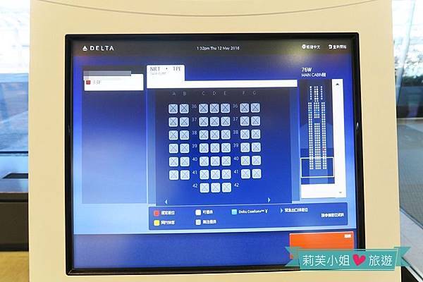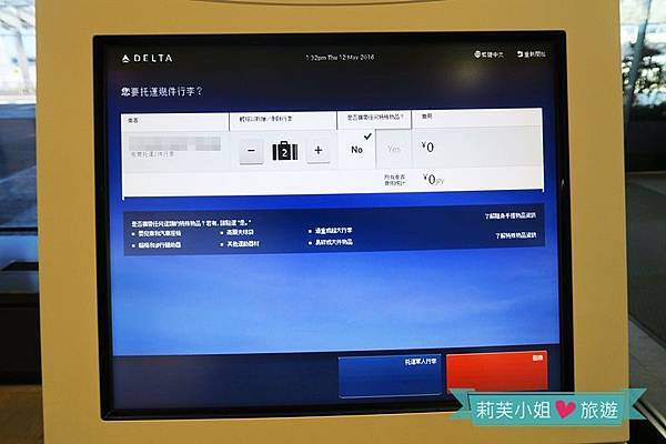 首先,掃描護照,接著選座位跟輸入要掛幾件行李,達美航空經濟艙最多可以免費掛兩件,沒幾秒登機證就印好。