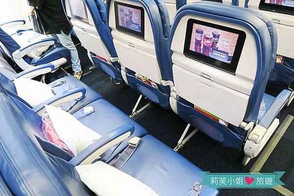 回程直接從經濟艙進去,依舊是熟悉的亮藍色皮椅,毛毯跟枕頭已經放在椅子上。
