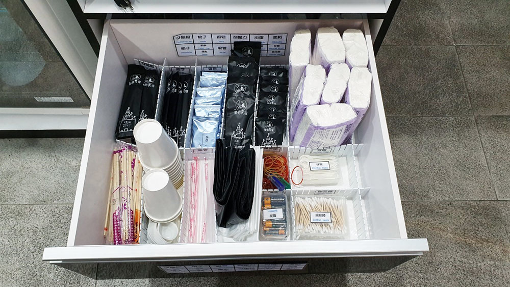 抽屜裡還有備品可以拿取,我記得一般的民宿應該不會像這樣放著給大家取用,通常是告知櫃檯取用,而且這裡的東西還挺多樣的,牙刷、衛生紙、棉花棒等等個人用品,連電池都有。
