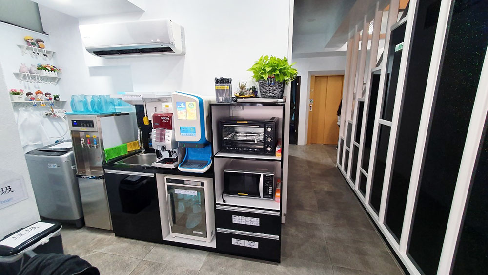 趁著他們上去放行李,在樓下走走,也幫他們看看公共空間這裡的設備,烤箱、微波爐、飲水機、咖啡機、洗衣機等等,東西很齊全。不怕食物沒料理的地方,衣服也有洗衣機可以使用。
