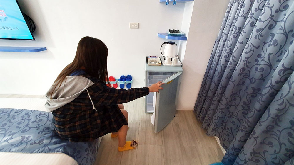 小朋友則跑過來說房間配備蠻齊全的,牙刷這類盥洗用具都有提供,還有小冰箱可以用,這樣逛完夜市就有地方可以放飲料啦。還開冰箱給我看,看起來是還蠻滿意的!