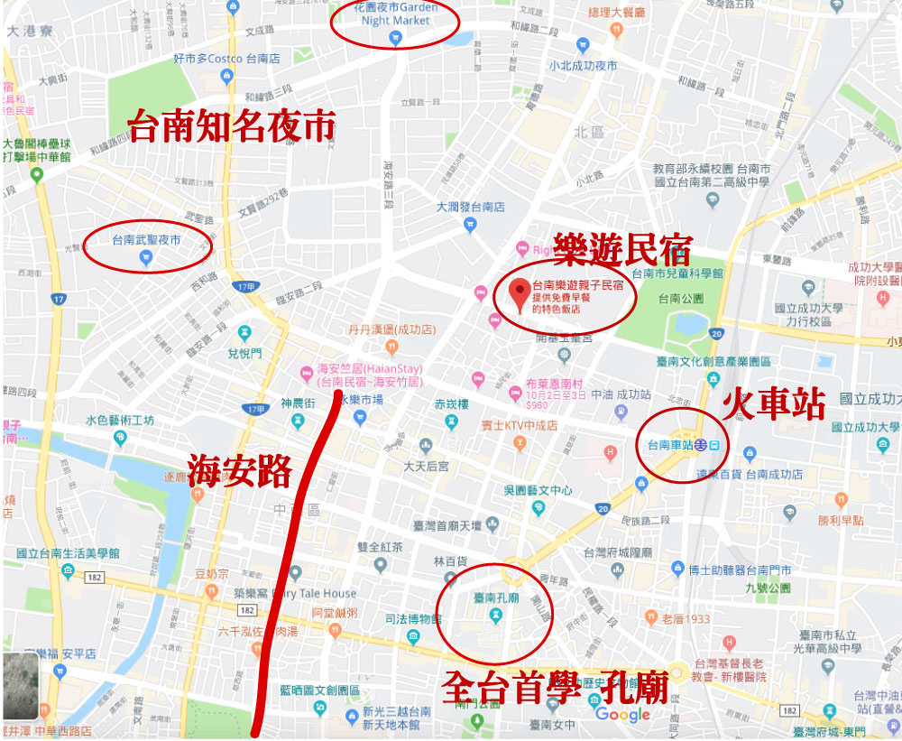 樂遊在交通樞紐的台南火車站附近,公園南路的巷子內,臨近火車站的周邊商圈,海安路、花園夜市那些熱門景點都能快速到達。而且民宿又在巷子內,隔絕外面喧囂,讓旅客有適當又安靜的休息空間。附上一張不專業地圖標示~