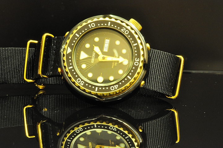 接下來是去年的敗家報告鮪魚罐那麼好吃, 一罐當然是不夠的當時的015以及017缺很大透過代購,來自日本雅虎的千米黑金鮪入手了7c46-70081998至今已十六年了鈦合金,無後開蓋,陶瓷圈實在令人著迷啊!哥倆好srp229的尺寸不輸老大哥,霸氣十足夜光也很棒或許黑金鮪面盤根指針都換過吧