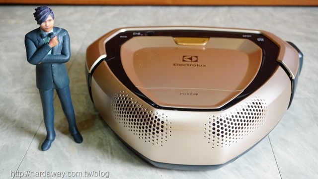 機身尺寸32.5公分(寬)*28公分(深)*8.5公分(厚),砂金色的伊萊克斯Electrolux Purei9型動掃地機器人,加上是三角形機身,說真的還蠻容易吸引人目光呢!