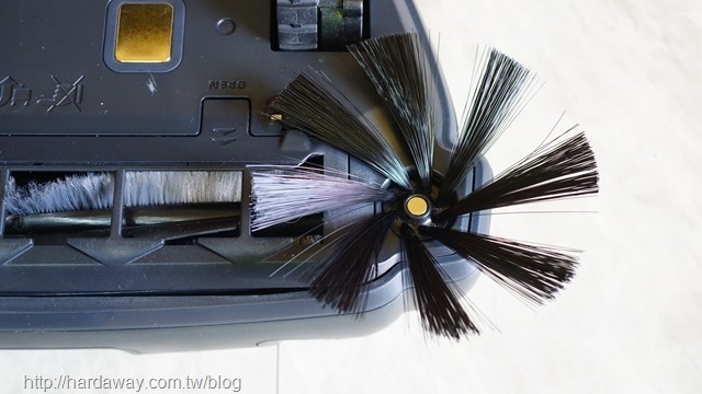 設置在機身最前端的滾刷,長度21公分,使用了刷毛與橡膠刮刀兩種材質,因此能將地板上的顆粒與微塵一起打掃清潔。