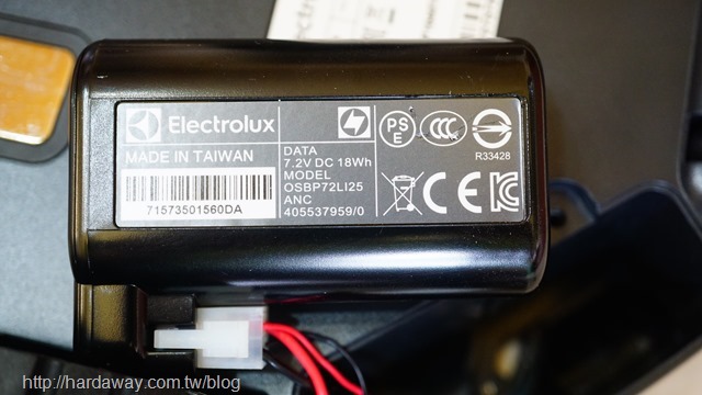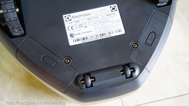 Purei9型動掃地機器人的動力,由裝在機身內的兩顆電池供應。由於想知道電池容量,所以將一邊電池蓋卸除,然後取出電池查看。不過,電池上面倒沒標示電池容量,因此只知道電池是在台灣製造的。