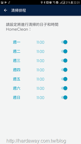 這個App提供的清掃排程是固定形式,每天只能設定一個預約排程,如果想要在同一天預約多次打掃,就必須在前一次打掃完之後再設定,感覺這是有改善空間的。