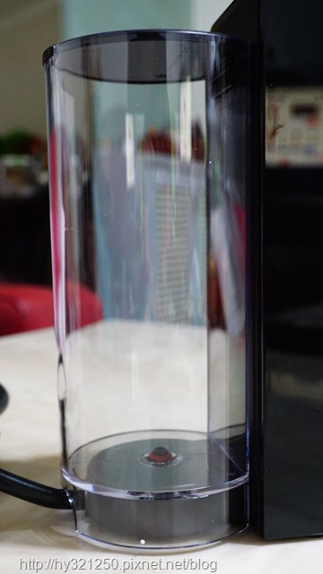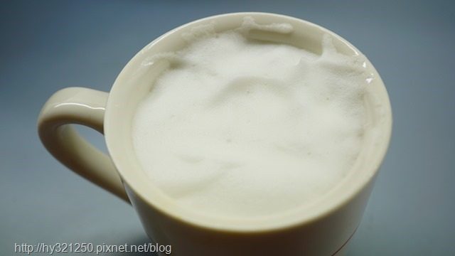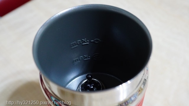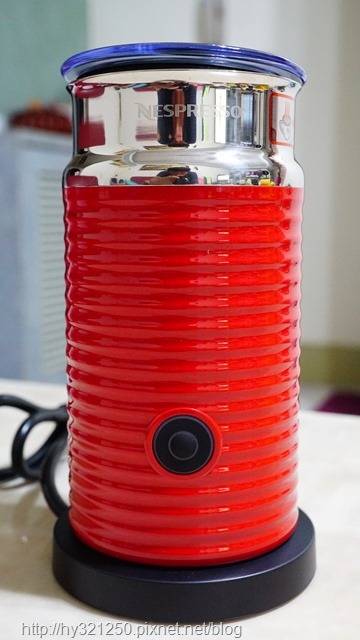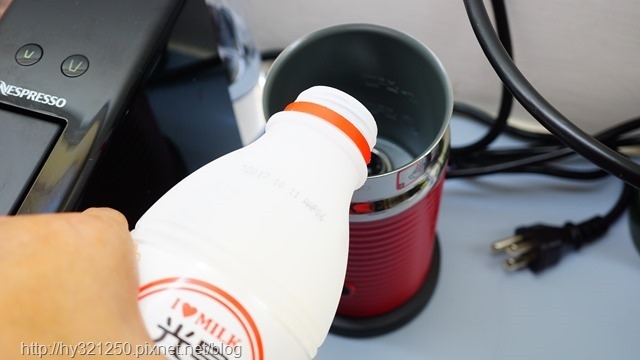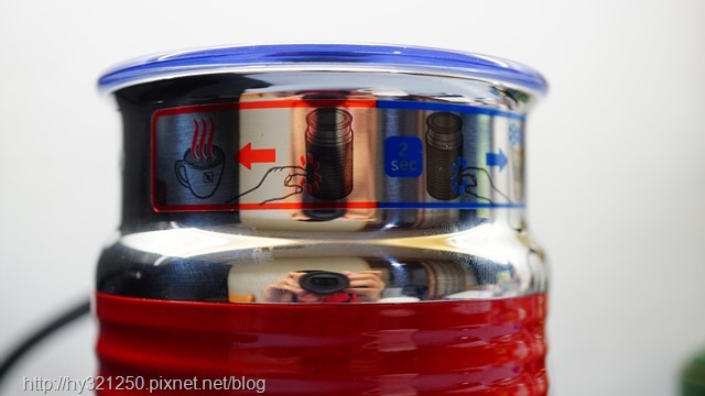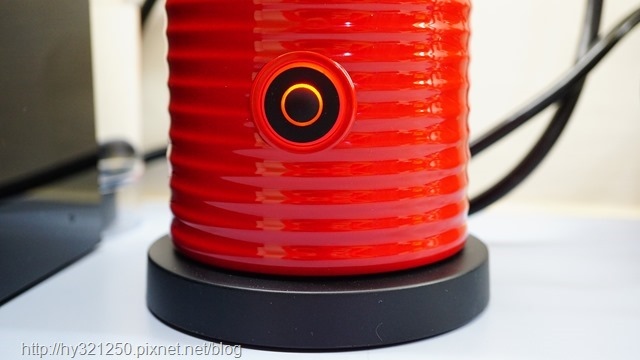 倒完牛奶,蓋好蓋子,按一下按鈕後,就開始製作熱奶泡,約70~80秒按鈕紅色燈光消失後(冷奶泡是藍色燈光),熱奶泡就製作完成了。