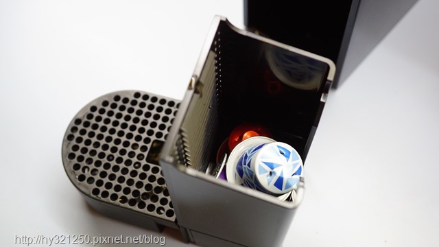 沖泡完的Nespresso咖啡膠囊,只要打開手柄,就會自動掉入膠囊回收盒裡。