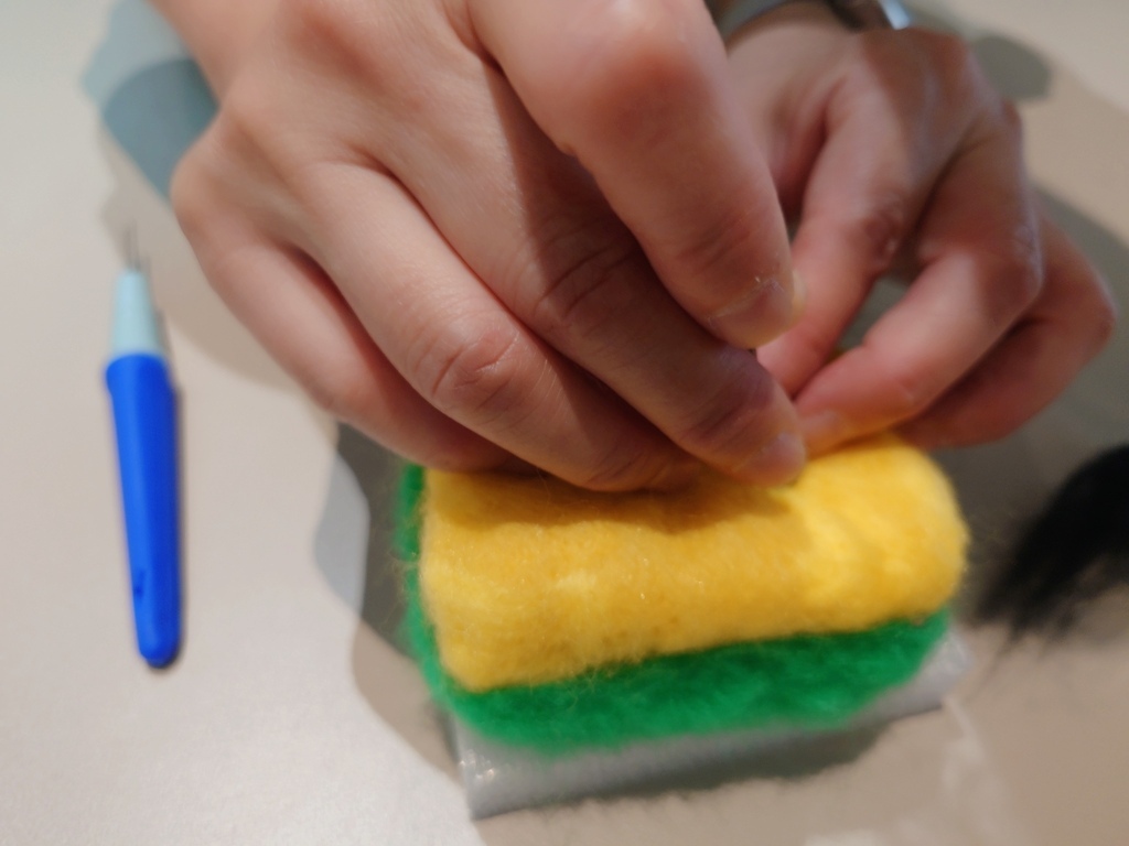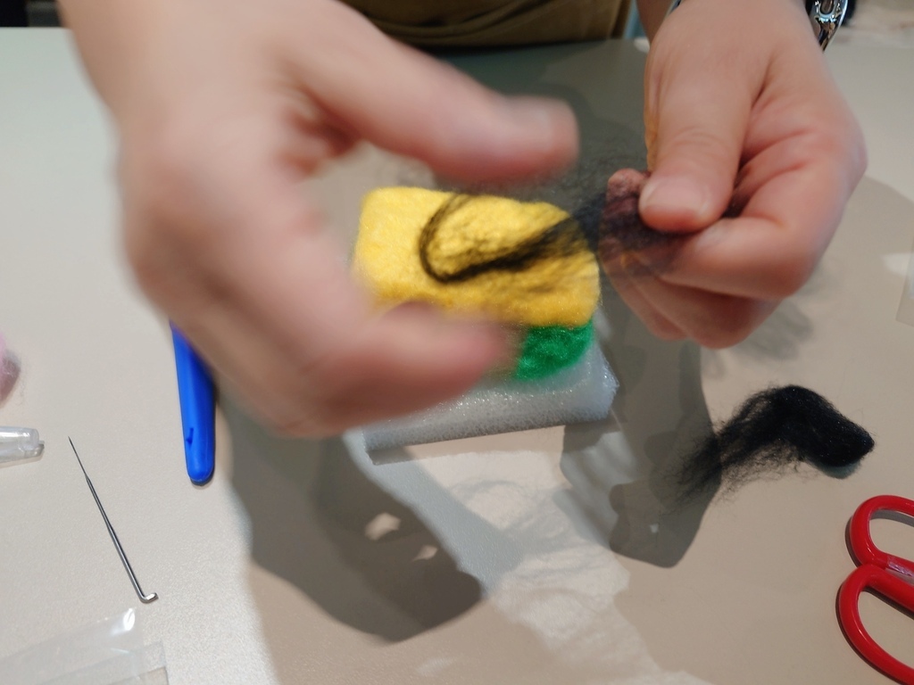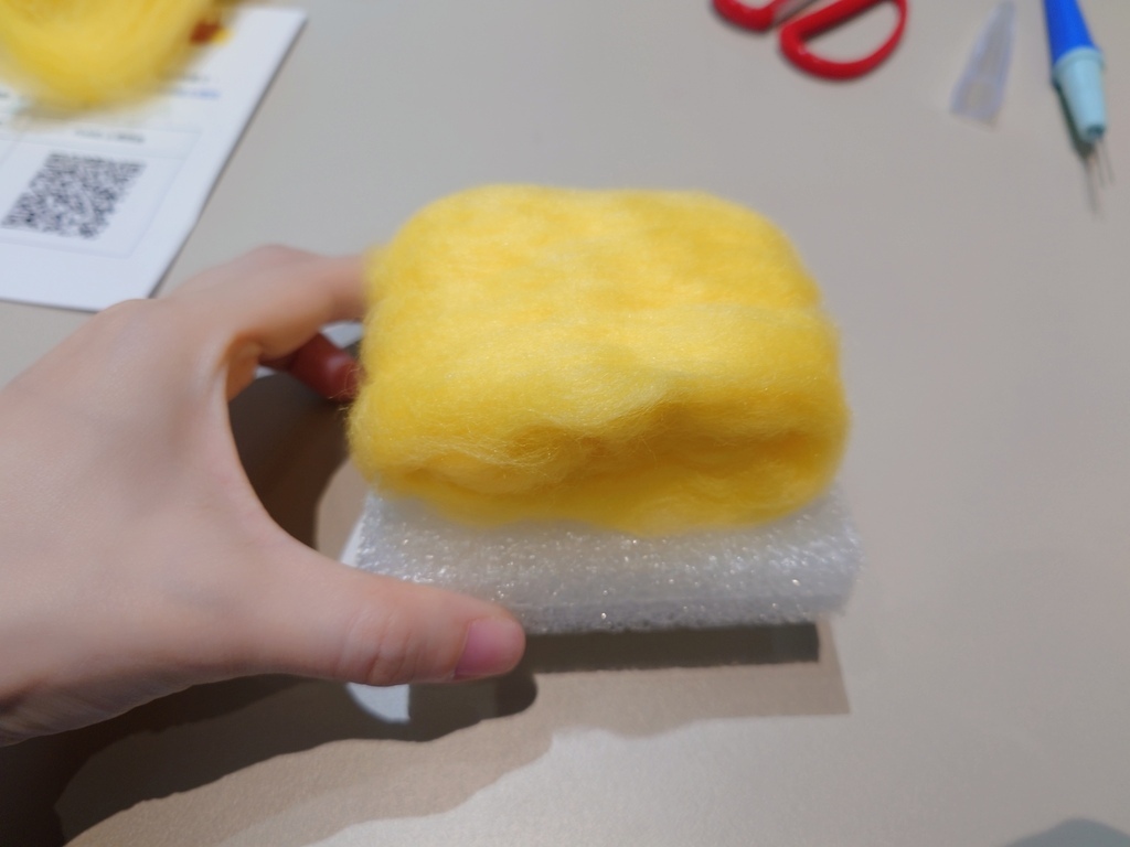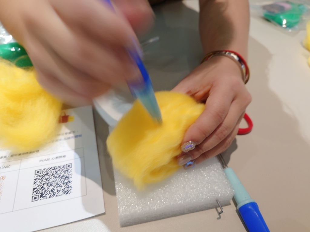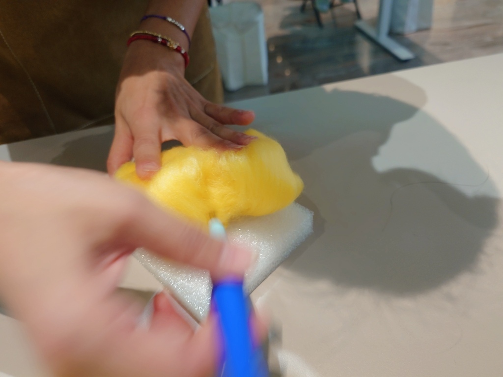 羊毛一開始柔軟得像雲朵,但只要一針、一針、再一針,密密麻麻地紮,原本鬆散的纖維會慢慢變緊、變實、變得穩固。