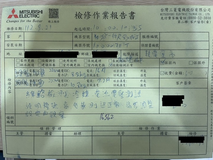 依照維修單上資訊剛開機有應該超頻運轉電流16安培。運轉約30分鐘有降頻電流7.2安培,假設功率因素0.9耗電大約1.425kw。不知道樓主平常使用人數大約幾個人?再者該空間密閉性如何?是否會有人員頻繁進出?這些也會影響冷氣耗電。另外請教看到車馬費是600元嗎?wu780401_78 wrote:原廠以來看過 附上...(恕刪)