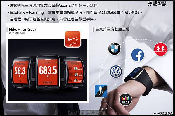 有了這一支手錶 , 使用者出門運動可以不需帶手機也能透過S Health或是第三方軟體如NIKE+......等來記錄運動過程..
