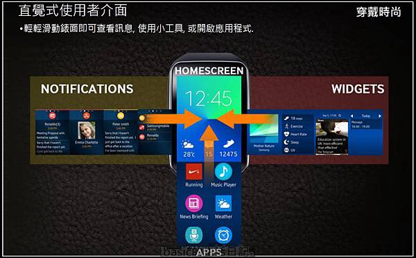 操作Gear S相當的簡單直覺 , 只要用手指從錶面的上下左右面來滑動即可切換各項功能..