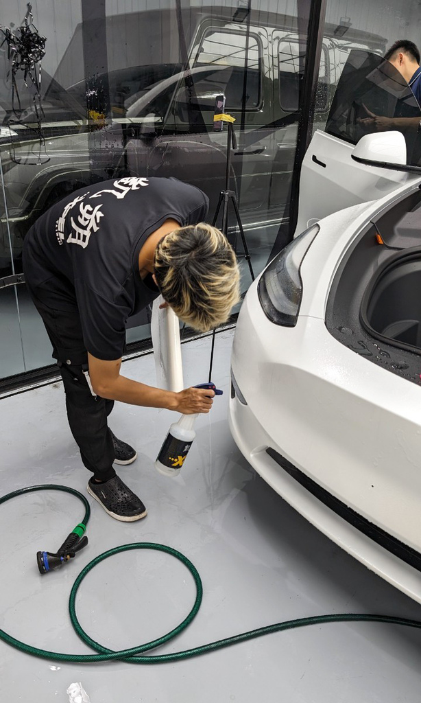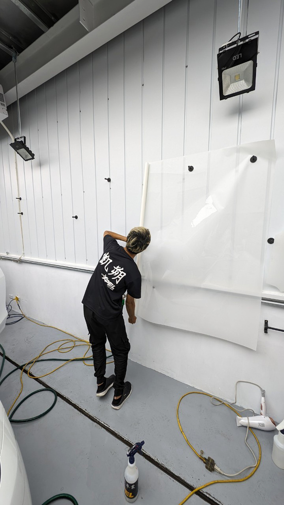 ▼接下來,師傅就開始貼膜了。先在牆面攤開膜料,邊撕邊噴灑XPEL專用安裝液,然後將膜料慢慢地貼上車身,並用刮板將膜料撫平,確保膜料貼合緊密。