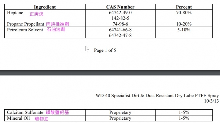 本樓跟主題無關 話說這一罐"WD-40 乾式潤滑劑",有趣的是WD-40從來沒有把它主打為"乾式鍊條油",而是用在機械或電動(電鑽、電鋸)工具的耗材(鑽尾、鋸子)上之降低磨損;金屬與金屬、金屬與非金屬[這一點跟"WD-40 矽質潤滑劑"很相似]{例如門或窗的滑軌與滾輪、抽屜的滑軌與滾輪}、非金屬與非金屬之潤滑[這一點跟"WD-40 矽質潤滑劑"很相似]。倒是全世界的用戶卻很愛把它當作"乾式潤滑油"在用!"WD-40 乾式潤滑劑"(220元,360ml) 噴在傢俱滑軌與滾輪上,一開始就不黏膩隨著時間也完全不會黏膩中文 MSDS-台灣版英文 MSDS-美國版英文 MSDS-英國版"WD-40 矽質潤滑劑"(160元,360ml) 噴在傢俱滑軌與滾輪上,一開始並不黏膩隨著時間越久就越黏膩中文 MSDS-台灣版英文 MSDS-美國版英文 MSDS-歐盟版英文 MSDS-英國版英文 MSDS-加拿大版英文 MSDS-澳洲版PS:甲烷(俗稱瓦斯)也就是天然氣;乙烷(俗稱瓦斯)、丙烷(俗稱瓦斯)、丁烷(俗稱瓦斯)、異丁烷(也可用作噴霧器中的壓縮氣體)都是液化石油氣的附屬品,通常可當作推進劑。-------------------------------------------------------------------------------------------------------------在我這一篇文章(建立正確看待與使用"WD-40 多功能除銹潤滑劑"的觀念)第98、99、100樓、101樓 有 whitesox大大 回覆了