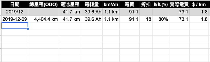 分享一下這個月,因為經常下雨改開車上下班,所以幾乎沒什麼在騎,這個月首次換電在 9 號,從下表發現 10 天約 42km 的里程電耗比上個月 43km 里程的電耗還高一些,這應該就是自耗電的影響所致!但即便如此,因為有折扣,所以換算下來每 1km 費用依然維持在 1.8 元。