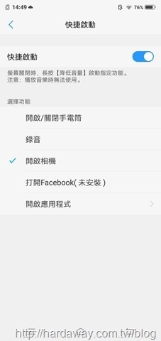 螢幕關閉時,長按降低音量鍵的快捷啟動功能,可在使用者自由選擇錄音、開啟相機、打開FB或開啟應用程式。另外,如果啟動閃光燈提醒功能,當螢幕關閉時有來電、訊息或行程提醒時,閃光燈就會自動閃爍提醒使用者。