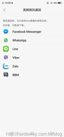 不愧是美顏自拍有名的vivo手機,在系統設定裡居然還有提供美顏視訊通話功能,當使用FB Messenger、WhatsApp、Line、Viber、Zalo與BBM這些應用程式進行視訊通話時,可以直接套用vivo專屬的美顏功能,不必另外使用其它的美顏app,還頗方便地!
