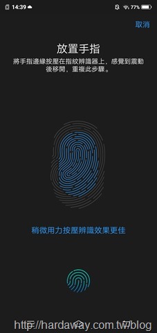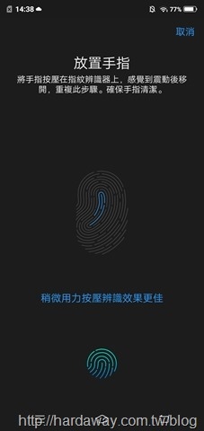 要完成指紋設定,會有兩段步驟,第一段是進行指紋內部範圍辨識,這時就依照手機畫面提示,手指分次進行按壓,直到辨識記錄完成。