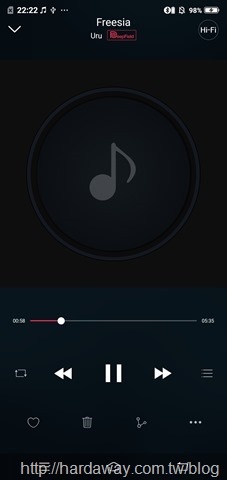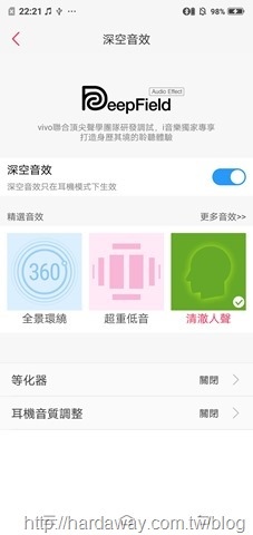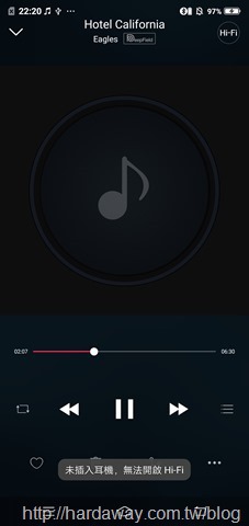 實際以我使用中的藍牙耳機,搭配i音樂app聆聽音樂,以Hotel 這首高解析flac音樂來說,在不開啟深空音效下聽起來就蠻不錯的。