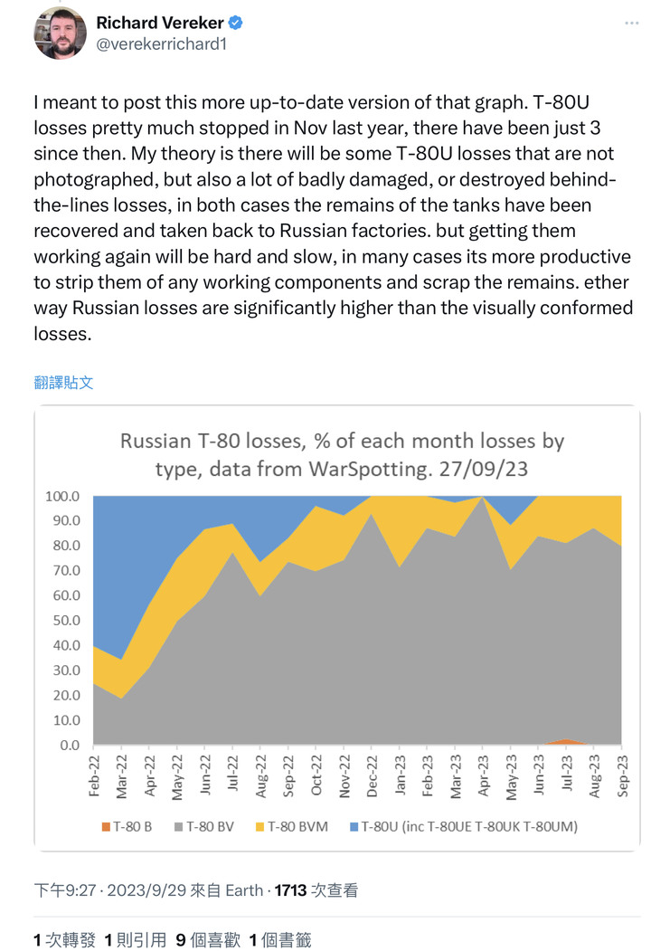 超級小任任 wrote:那你怎麼不說這邊炎炎...(恕刪) 15-25度本來就不是炎炎夏日,但這觀察就當我沒說,我不想浪費時間去爭論不確定的東西。我只能告訴你,烏克蘭戰報極具參考值值,儘管它存在一定的誤差,但至少趨勢是合理的。有數字,加上其他佐証,就可以做一些判斷,這是一個輔助工具。沒必要相信那個絕對數字,絕對數字就算正確,也無法決定誰勝誰負,真正決定勝負的是現況, 不是過去。這些數字,只是提供現況改變的方向和可能產生的後果。數字多少,我過目即忘,記住也沒用,只是記得那個趨勢,然後參考比較專業的分析。你不參考就沒用。但我是每天看數字,看地圖變化。看別人的說法,看戰況雙方傳出來的信息。這些數據,西方援助國,觀察家會看的,也會依據這個數據自行修正。烏克蘭如果提供不實資料,是會被質疑,影響援助國的信心,進而減少援助,所以數字的可靠度會比較好。這一篇的德文推特版,我前面樓有貼,這裡他整理成完整的英文版比較好閱讀,他有自己更詳細的武器損失種類來源。這一篇談 火炮的損失變化,數量是跟官方提供的一樣,但他還有官方沒提供的武器型號。以前有一篇專門談坦克的變化去預估蘇俄目前生產的坦克型號,跟消耗的速度. 他引用的資料都比官方提供的資料還細。