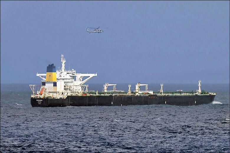 美國海岸防衛隊在加勒比海展開強力執法,20日在委內瑞拉外海國際水域,再度攔截並扣押1艘懸掛巴拿馬國旗、載有180萬桶委內瑞拉原油的中資油輪「世紀號」(Centuries)。圖為美軍直升機在該油輪上方盤旋監控。(路透)