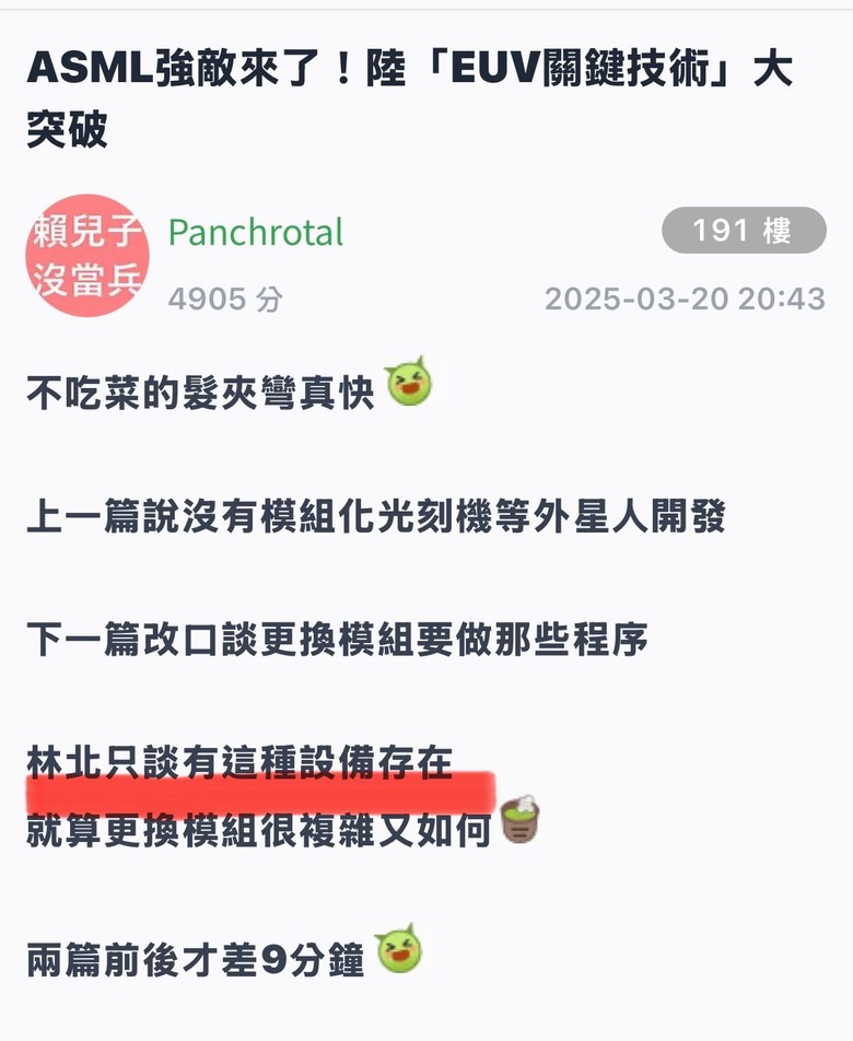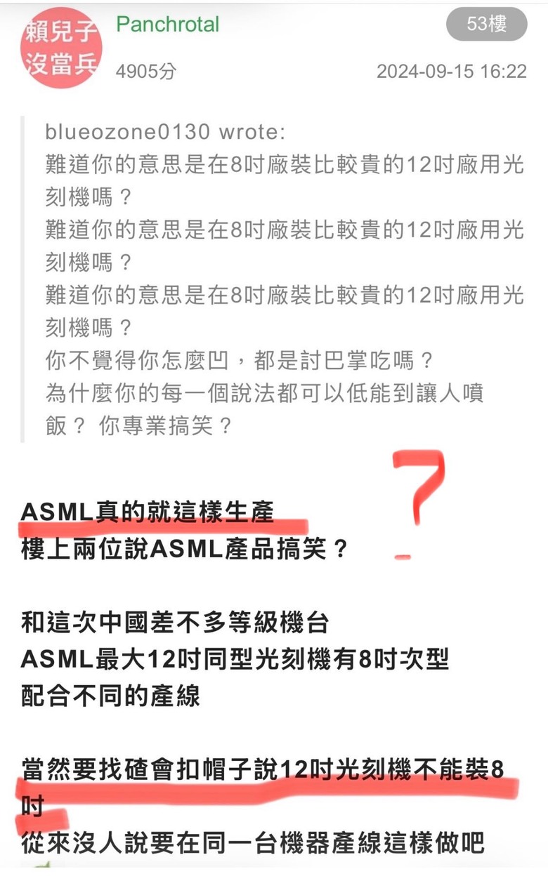 Panchrotal wrote:誰提過機台停下來?你找出我說這段話我全家橫死沒找出我說這段話你全家橫死 已經有人問你在8吋廠裝12吋光刻機嗎?你的回答是什麼ASML 真的就這樣生產這句話可是你說的。請回答你說過的而不是一直跳針個不停