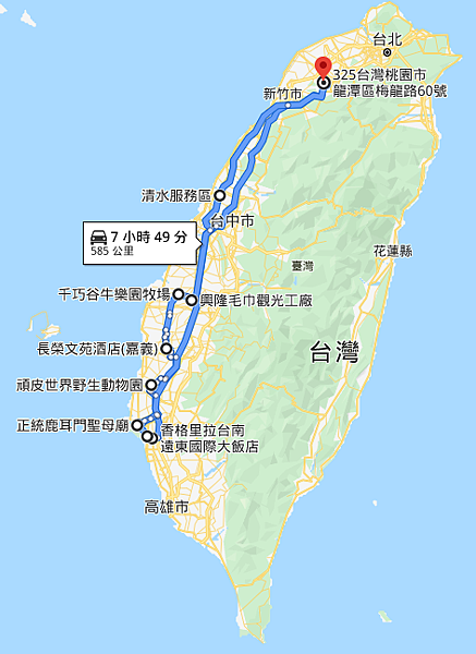 最後,來張google map,三天兩夜的行程,好玩。行程快要半個台灣。有acc,開車不會累。換上了peugeot 3008,冷氣涼的快,空間也大,老婆、小孩坐起來也高興。