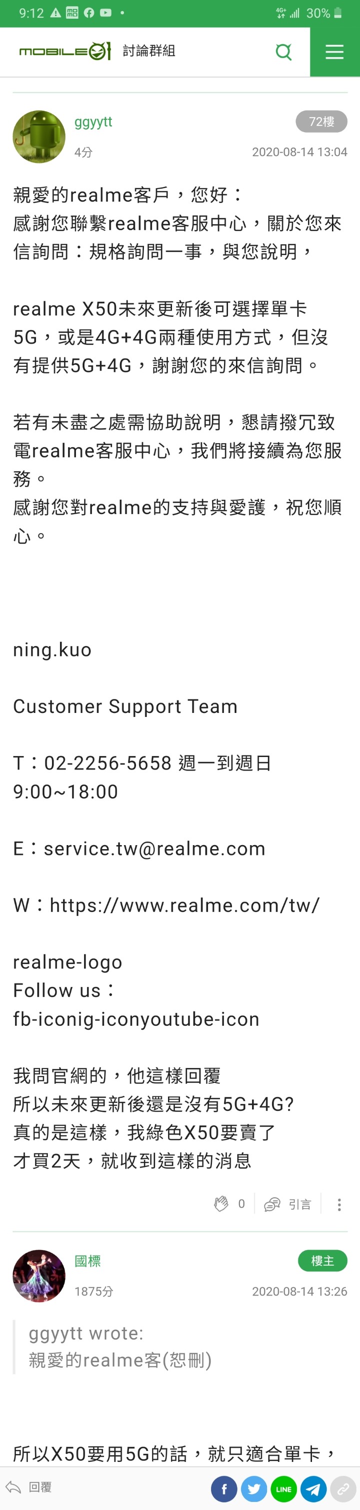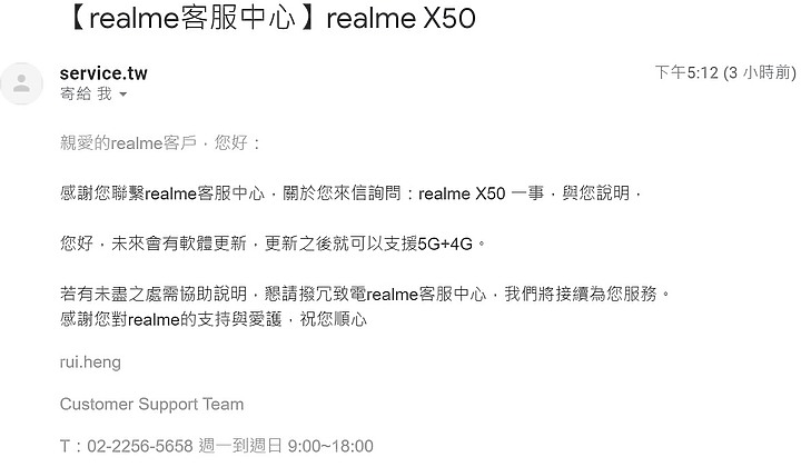 因為目前擁這顆處理器的機款還不少其他機款明明都可以更新 如果真我這支不更新多少會影響銷量 目前有客服回覆算放心多了可能只是時間早晚吧 就像以前S7E升級4G+3G拖拖拉拉的但最後還是升級了另外這邊順便回報 X50只要是台灣合法公司貨沒發票也有保固 而且還有到府收送喔若沒發票保固起始日就是以第一次開機連網開始計算若有發票當然就是發票日起算1年為保固期還可以致電客服報上IMEI碼 客服會幫你查詢02-2256-5658 週一到週日 9:00~18:00國標 wrote:所以,客服也出 更新(恕刪)