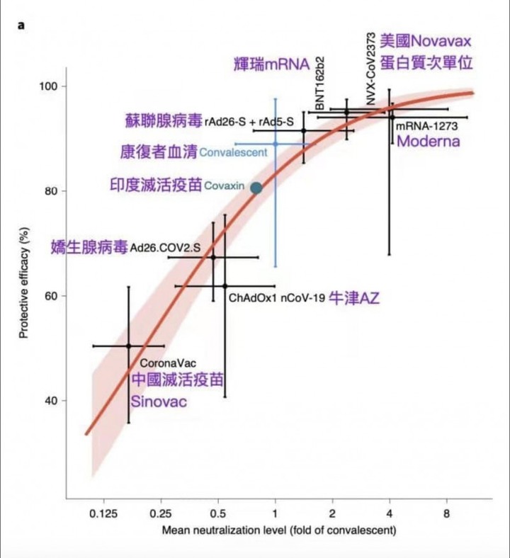 以康復者血清為標準1AZ的中和抗體為0.6倍左右因為AZ疫苗有重症100%保護力所以應判斷中和抗體多於AZ疫苗則亦能100%重症保護力Delta中國病毒會讓各家疫苗的中和抗體量減少故使得打完疫苗仍確診輕症時仍可能維持較高病毒量。不像alpha病毒對完成疫苗接種者是輕症且低病毒量。這差別在於:中和抗體量喔!很羨慕打莫德納、與台灣高端疫苗的人他們的中和抗體可以比AZ更多抗體保護(同樣地,中國疫苗打三劑,還比不上一劑AZ,真是可憐,難怪只能嚴格封城)