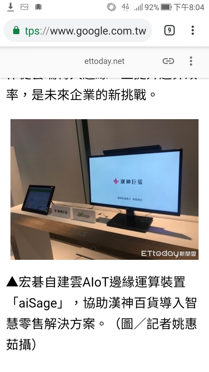 這一波FaceMe,看來比預期導入商用的速度快很多,應該是宏碁的施宣輝準備要接棒,所以要打響名號,之前週刊有報陳俊聖不想放手職位..........今天展示宏碁的新應用一定會帶給訊連AI很大的幫助,從照片的人物就知道有多重視,訊連站在巨人肩膀上(最近宏碁不錯,華碩落難)。連漢神百貨也有