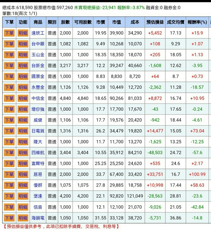 謝謝,大致明白了。小弟是傾向結果論的一個人,依照今日的結果來看,大大的操作是正確的。-----------------------------------------------------------小弟在最近1個月內,也學習大大方法,將閒置資金投入股市,現在手上約有35檔股票〈恕小弟無法像大大一樣大方公開〉。到目前為止總體的未實現損益是賺,而小弟預估今年總體的平均殖利率約5.8%,〈有些股小弟真的買不下去,所以很佩服大大〉只是買完後的現在,沒事做就開始想東想西了