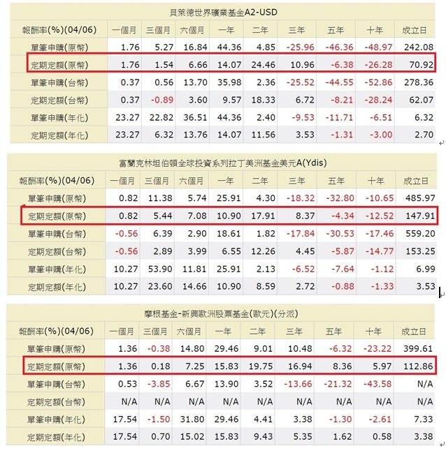 好幾年前一直定期定額再扣幾支基金,但是目前依然還是負的報酬,不知道未來要繼續定期定額還是轉其他標的或者直接贖回,懇請各位有經驗或高手指點迷津。基金如下:1.貝萊德世界礦業基金A2美元 -32.83%2.富蘭克林坦伯頓全球-拉美美元 -18.08%3.JPM新興歐洲基金歐元分派 -17.39%裡面所有的投資金額幾乎是我近十年來辛苦工作的積蓄,讓我不知所措。