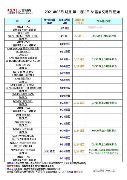 2021年 3月 期貨 第一通知日&最後交易日 通知