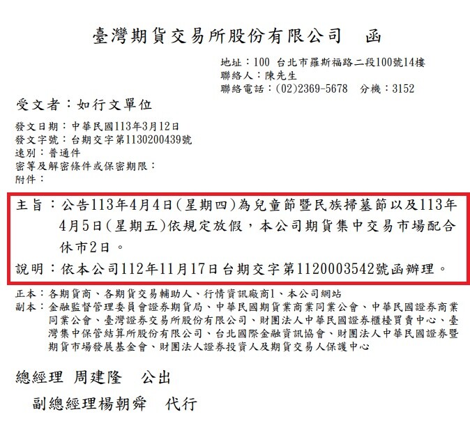 https://photox.pchome.com.tw/s19/jo782400/1/171046321288/【台灣期交所】公告2024年4月4日(四)、4月5日(五)兒童節、清明節,台灣休市2天公告集中交易市場113年4月4日(星期四)及4月5日(星期五)休市2日。海期市場正常開盤;可以交易喔!!元富期貨小靜提醒您:)