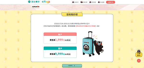 於2023/7/24~2023/12/31首次申辦玉山熊本熊卡正卡於核卡後45天內新增國內一般消費,累積滿額贈【熊本熊官方授權20吋行李箱】1個!