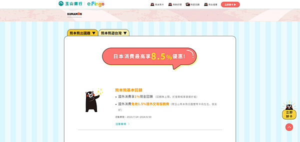 國外消費免收1.5%國外交易服務費(限玉山熊本熊日圓雙幣卡向左左、很友好)