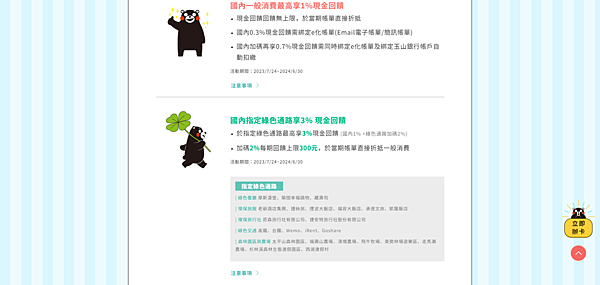 國內指定綠色通路享3%現金回饋 於指定綠色通路最高享3%現金回饋 (國內1% +綠色通路加碼2%)