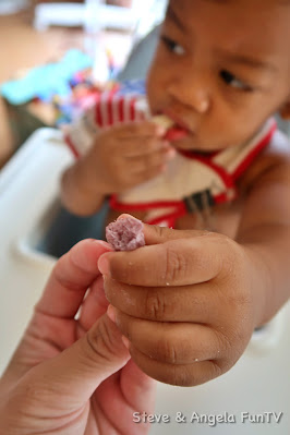 我們一直很堅持不讓Tater吃任何有添加調味的東西,Tater的食物都是我們自己從食物的原型來準備的,Tater6個月以後,我們開始幫他設計學習自己吃飯的課程,這個時候的Tater因為沒有幾顆牙齒,所以他可以吃的食物幾乎都要煮的軟軟的,而這種形態的食物,真的不好用手抓起來,好不容易抓起來,但是又被Tater捏爛了。