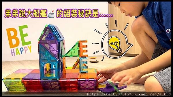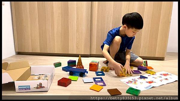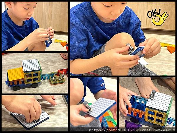 將「磁力片」(藍色)和「拼接片」(灰色)組合一起,對於6歲弟弟來說可說是輕而易舉的事唷!