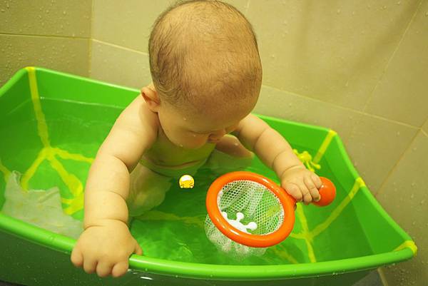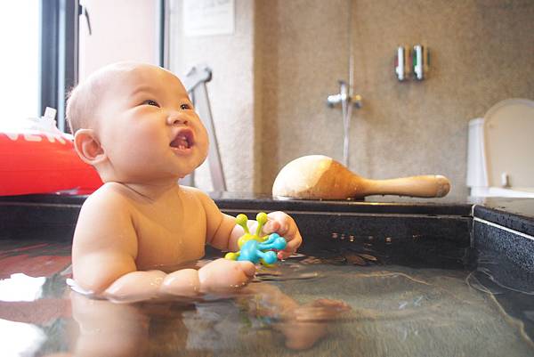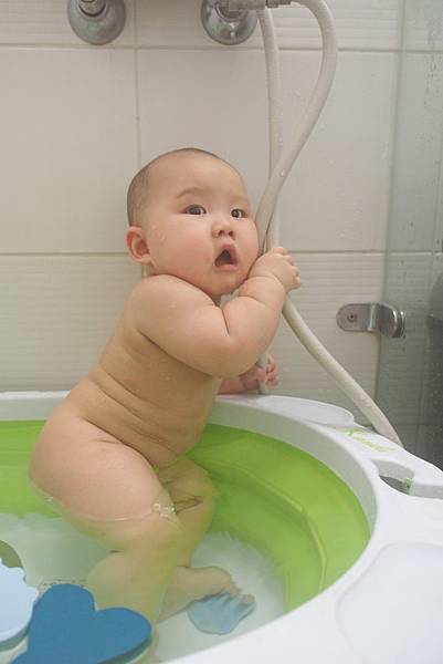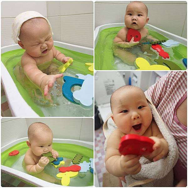 少晞五個月多會坐了後,洗澡就不喜歡躺著,一直想要坐著洗,爸爸就說是不是該買洗澡玩具給少晞了呀?!