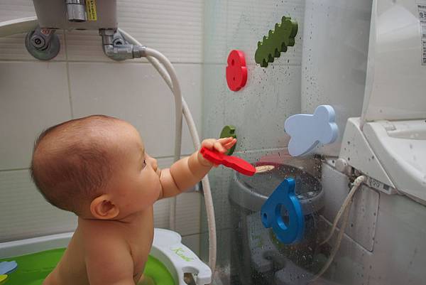 從此之後,少晞洗澡就從坐著洗又進階到了只肯站著,這時候飄浮玩具沾濕後可以貼在牆上,又是另一種玩法囉~