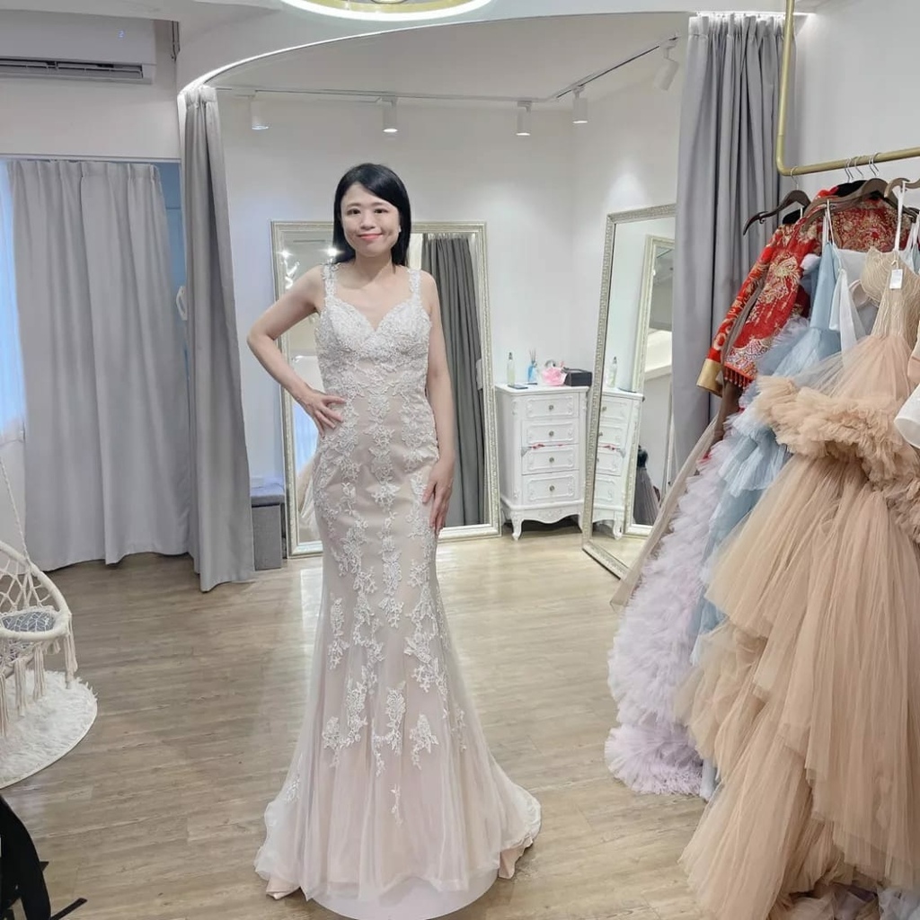 就算沒有想要結婚,現在也很流行一人婚紗寫真服務方案,為當下留作最完美的一刻,日後還可以常常拿來欣賞~~說到囍聚手工婚紗禮服工作室的禮服,我今天試穿了5套美式輕婚紗魚尾裙,是最受年輕人喜愛的美式輕婚紗,而我的身高168公分/55公斤的平胸身材所穿的都是M號婚紗,特別是綴有白色亮片的蕾絲婚紗是有點重量的,做工細緻又華麗,簡潔線條中自帶光芒四射的濾鏡 ,穿出去絕對會成為全場焦點,每一套我都很喜歡!