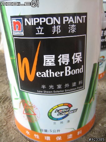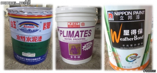 慢工出細活,越到後面, 遇到我們這麼龜的業主.大慨工期要加一倍.再來發個油漆的開封文好了.來個 油漆PK賽常聽人家說有了小孩後, 才知道如何當爸爸.我現在是自立建屋後, 才知道油漆的種類何其多也?最常分類的是:室內漆戶外漆特種漆 : 如木頭漆 / 鐵漆/透明漆 ....... 等.現在重點是擺在戶外漆.1. 外牆表面已上一層"大理石漆" + 一道 "水性底漆".2. 顏色 : 要介於"奶黃色" & "檸檬黃"於外牆上.3. 功用 : 必需是耐候日照及防水經過明查暗訪.打電話去各油漆廠總公司詢問相關細節及優缺點.教各位一個小撇步:1. 假裝自己是很大的客人-大戶, 不管是要當建商/營造商還是賣房子......2. 問他們自家產品之特性及適合的油漆, 也順便問一下他們競爭對手的產品 (如去問A公司問B公司的產品)3. 問油漆師傅.通常這樣一路問下來, 基本上不是專家也是半桶水唬爛家.當然上 Mobile01也是個不錯的選擇.通常這樣一路問下來, 基本上不是專家也是半桶水唬爛家.對於產品之比較表, 可能要麻煩各位上 Blog看了. (不會貼表格)對於產品特性, 其實不是專家, 也很難去 Judge.但其排列組合有下:適合我們的如下:1. 直接用 "虹牌"調合漆. (由長油型醇酸樹脂及耐候性顏料組成 , 看起來是 防蝕塗料, 有相近的顏色可以選用)優點 : 顏色均勻. 有色可選缺點 :不知是否防水耐候耐紫外線 ?需再加一道透明防水漆?2. 用"金絲猴" 627 壓克力彈性防水膠 + 色彩手工調色優點 : 看起來好像較為防水, 適合外牆做用缺點 : 沒聽過 "金絲猴", 不知品質如何?"顏色"要手工調, 可能四面外牆顏色不均勻.廠商建議最後再加一道透明防水漆.一道底漆 + 2道面漆 +一道透明防水漆3. 用 虹牌" 水性彈性塗料漆"優點 : 感覺好像也較適合外牆 300%彈性缺點 : "顏色" 只有一種黃 "象牙黃"加入樹脂/橡膠, 不知是否耐日照, 一般來說樹脂類的, 日照久後會失效?4. 用虹牌"水性水泥漆"優點 : 最便宜, 最多人使用, 顏色多可選缺點: 無法防止輕微的裂痕.5. 用立邦 " 屋得保半光室外塗料"優點: 電腦調色, 310%彈性, 防禦性最佳缺點: 最貴.看了這麼多, 聽了這麼多.腦筋已快打結了.不過即然我們選擇了外牆用油漆而非磁磚, 就要用上最好的. (以後還可以來個變裝秀)衡量一下價格, 雖然最貴比起最便宜約2.X 倍.但實際算起來只是所有建照費用的千分之...............還是不管價格了.選出高規格的入選者.最重要的是"色彩".最重要的是能入老婆大人之眼.誰叫她是"外貌協會" 畢業的.最後入選的就是最貴的........ (理論上應該也是最好的)好了, 來看一下開封文, 沒圖沒真相:先上一道大理石漆.再上底漆. (事實上在這之前還有上過一道)虹牌406戶外漆 (為了配合我們選的面漆顏色特別用這顏色)再來重點貴森森的立邦漆.一箱箱的, (看起來好像比一桶桶高貴一點 ==> 自我安慰)開封囉!驗名正身一下看起來顏色蠻深的.漆上後的比較. (第一道)看看完成度 90%的樣子. 延伸悅讀.1. 外牆漆ing - 杜邦屋得保 Jasmine2. 戶外漆 PK賽 => 虹牌 vs 金絲猴 vs 杜邦