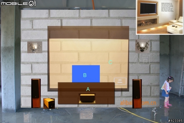 趁著還在收屋瓦及牆面時.先來 Workout 客廳電視牆的design.之前已經有一個 concept, 但一直還沒仔細思考要怎麼用.先把 concept PO出, 希望能廣徵各位想法.原則上不想要太複雜的設計.利用樓梯下的空間.牆面先暫用女王喜歡的文化石效果, (不過這個看起來好像有點醜. )各位可以給些意見嗎?原圖 :亂貼圖:尺寸太約,誤差不會太大.A : 如右上圖之示意. 一個凸出的實木板. (深入樓梯下, 以利放各種電器用品......)B : 42" TV (便宜方便就好) 平常很少看電視 (無第四台), 想說不要放電視, 女王又不肯. C : 電視牆 (約 330cm X 600cm) => 想要做木板, 再以特殊漆表現 (不知有那些可選, 石頭漆/彷木漆/.........)D : 120" 布幕 for 網路source & 小朋友看.E : 想要裝二個壁燈, 不知適不適合?其它 :歡迎各方意見................