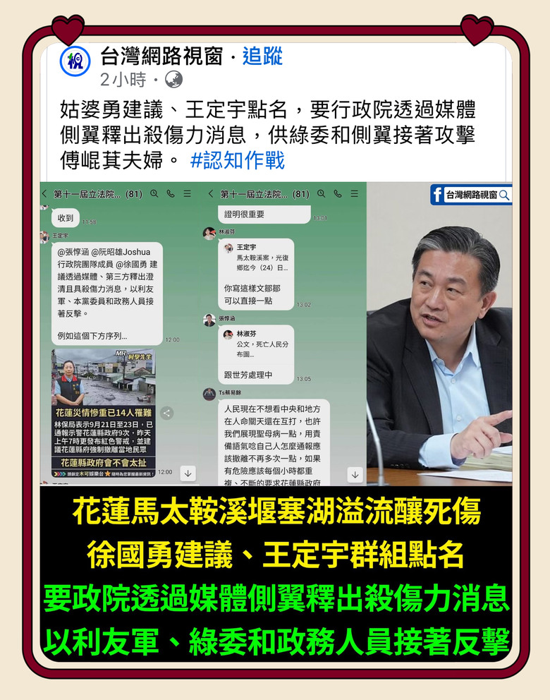 民進黨立委王定宇在黨團群組要求政院釋出「殺傷力消息」反擊‼️‼️‼️不料對話卻遭截圖外流,導致民進黨遭外界攻擊。對此,資深媒體人王瑞...