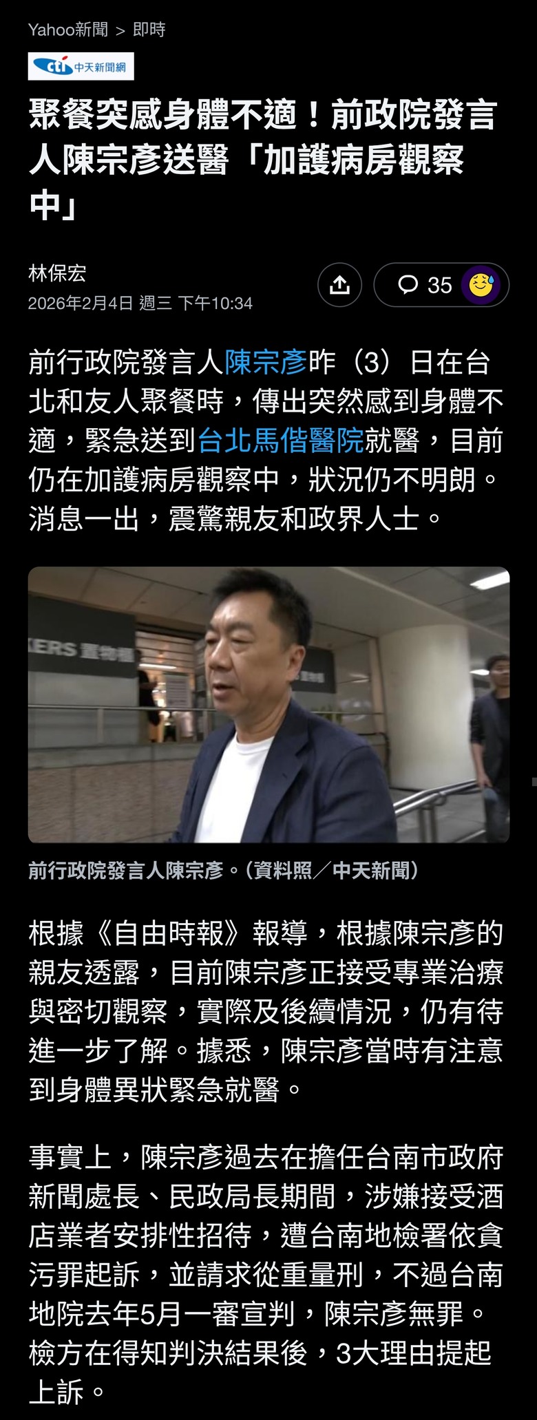 聚餐突感身體不適!前政院發言人陳宗彥送醫「加護病房觀察中」